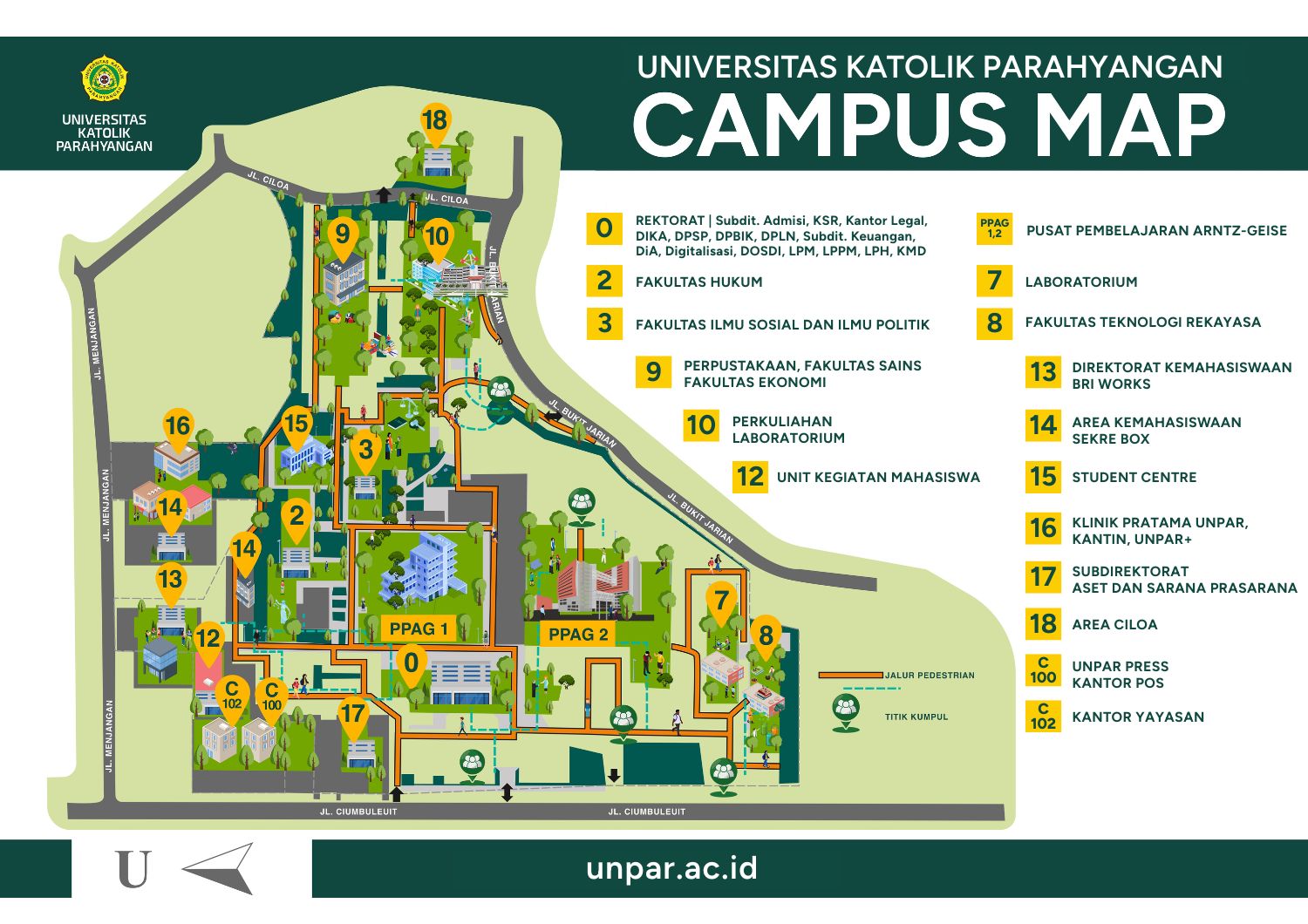 Universitas Katolik Parahyangan memiliki beberapa gedung dan fasilitas yang digunakan untuk menunjang kegiatan civitas akademika. Untuk mengenal lebih lanjut mengenai lokasi gedung dan fasilitas yang terdapat di Kampus Ciumbuleuit dapat melihat gambar peta kampus di samping agar lebih mudah dalam mengenali lingkungan kampus.