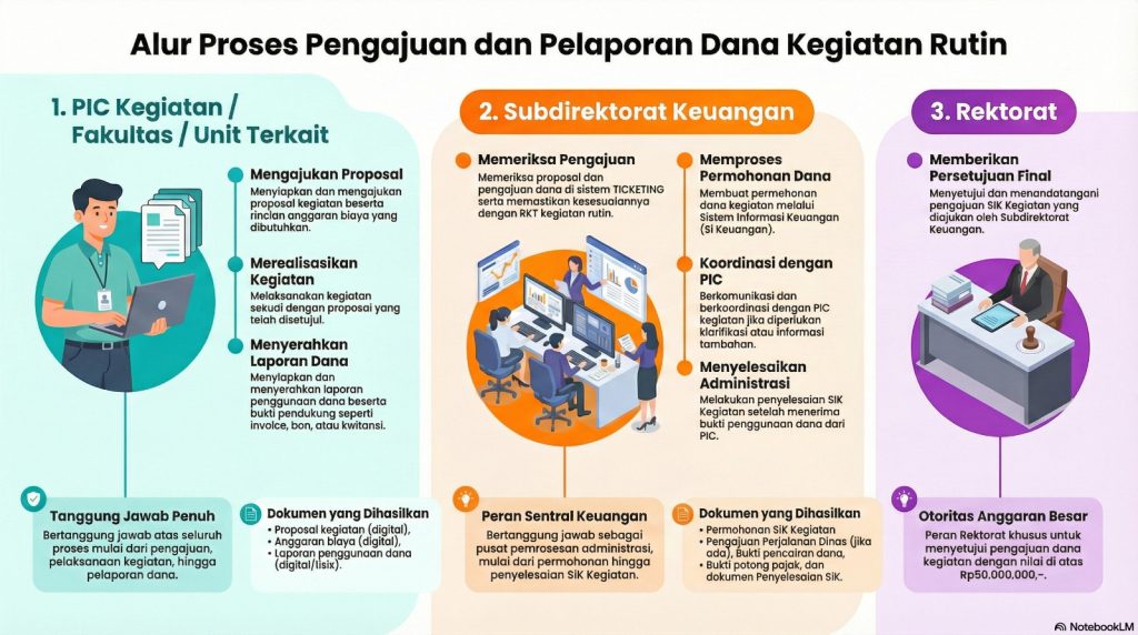 Pengajuan kegiatan rutin dilakukan melalui Sistem Ticketing. Silakan klik tombol merah “Layanan Ticketing” untuk memulai pengajuan.