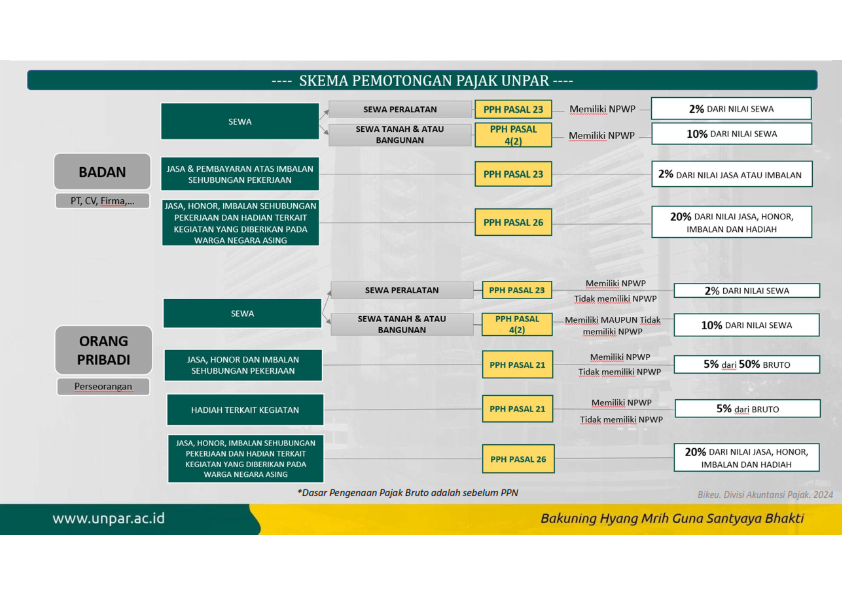 Setiap transaksi penyerahan barang atau jasa yang termasuk objek pajak, maka wajib dilakukan pemotongan pajak sesuai dengan objek pajaknya berdasarkan skema di atas. Pajak dipotong dari nilai transaksi bruto dan tidak diperkenankan gross-up.